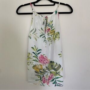 This sleeveless tank top from New York & Company is fully lined and features a relaxed fit with elegant pleats at the neckline, offering a chic and comfortable style. The yellow, pink and green color palette of the flowers adds a vibrant touch, making it a versatile addition to any summer wardrobe. Perfect for warm weather, this top is both stylish and breathable. Adjustable tie closure at neck. One small mark on front of blouse (see photo).