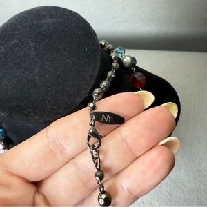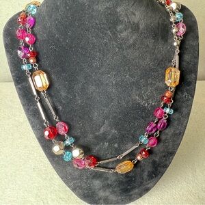 NY & Co women’s multicolor beaded necklace featuring vibrant pink, blue, and orange beads with a lobster clasp closure. Long length—great for layering or wearing as a bold statement piece. Fun, colorful, and perfect for summer or festival looks.