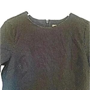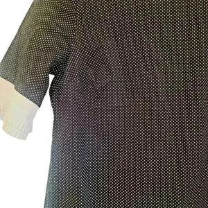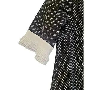 NY & Co Women's Black & White Mini Polka-dot Rayon/Nylon/Spandex Stretch Cotton Fitted Dress w White pleated Poly Trim on Hem of Sleeves, Back zipper, Lined