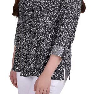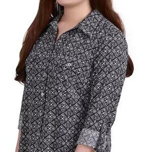 NY Collection 3/4 Sleeve Notch Collar Blouse - Black & White Geo MP NWT