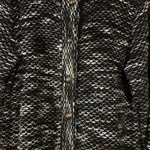 Elegant black and white cardigan with textured design. Features button-up front. Ideal for layering. Size XL. Does have a lose thread.