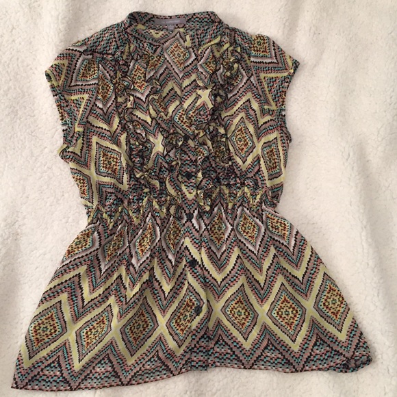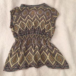 Pretty print blouse that flows! The dark parts of the print and a very dark brown, but looks black from a distance. Size small but fits like a Medium.