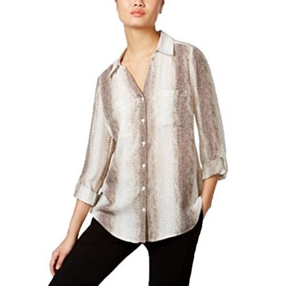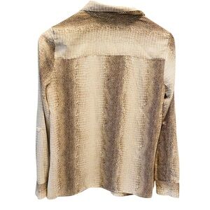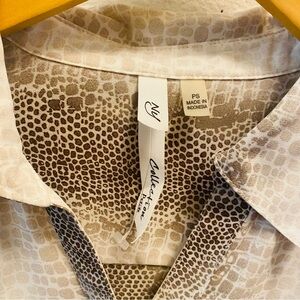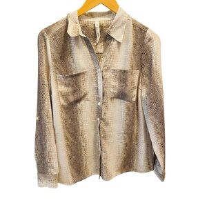 Gray snakeskin print button down utility blouse by NY Collection. EUC. Size small measures shoulder to hem 24”, armpit to armpit 18”, waist 17”