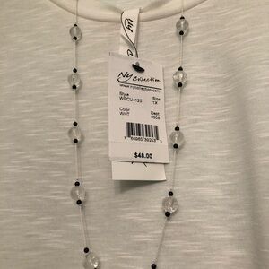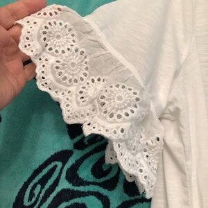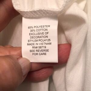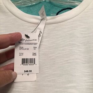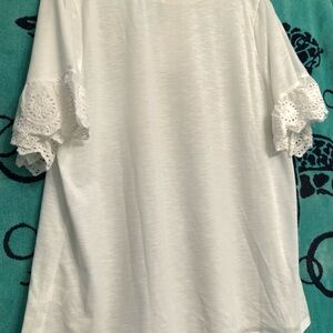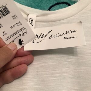 The NY Collection Cream Ruffled Short Sleeve Tee is a stylish top featuring delicate ruffled sleeves that add a touch of elegance. Made from a soft, comfortable fabric, this tee offers a relaxed fit perfect for casual wear. Its classic crew neckline and standard length make it a versatile addition to any wardrobe.Never Worn-smoke free home; feminine; & lightweight. Added a sweet Summer light necklace to be included in sale. Wear with black shorts, skirt, or pants & you’re ready for a classy casual look.