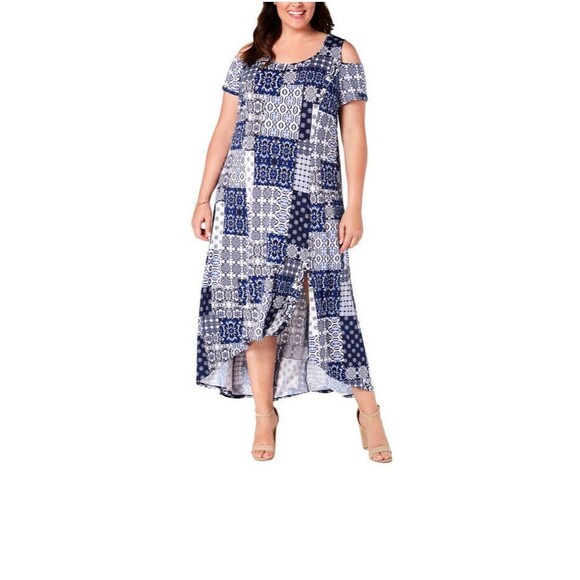 NY Collection Maxi Dress High Low Printed Plus Size 2XP Cold Shoulder Slit