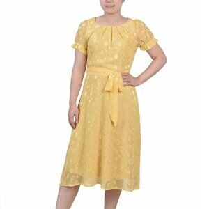 Brighten up your wardrobe with this charming and cheerful Swiss Dot dress by NY Collection. Designed in a sunshine yellow with playful circle detailing, this flattering petite-fit dress features a pleated scoop neckline, short sleeves with ruffle hems, and a matching self-belt for the perfect feminine silhouette. Whether you're heading to brunch, a garden party, or a special event, this dress delivers effortless elegance.