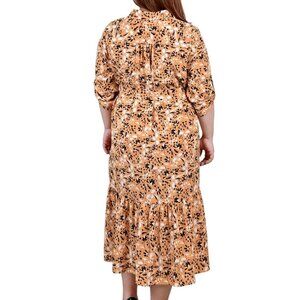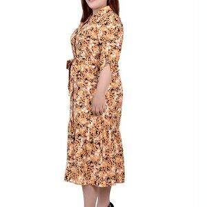 NY Collection dress, plus size midi dress, belted tiered dress, long sleeve midi, black gold dress, 3X printed dress, stretch woven dress, notch collar dress, work to weekend outfit, NWT plus size fashion