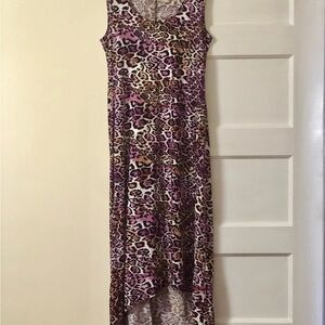 Chic high low dress with a bold leopard print. Features a sleeveless design. Perfect for stylish outings. Spandex material.