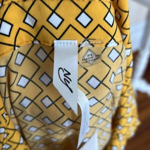New with tags, NY Collection yellow shirtdress. This cute dress has a button front, collar and self-tie fabric belt. Small black and white print on the yellow background.