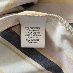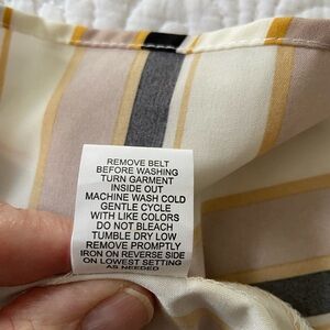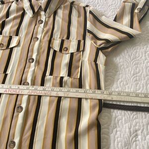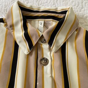 Chic long sleeve with roll tab dress with bold stripes. Features button-up front and chest pockets. Ideal for versatile styling. NWT Taupe, cream, gold and navy stripes Lightweight, classic, business casual, Church