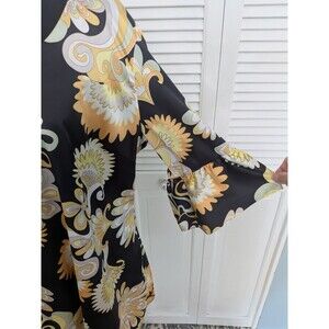 The NY Collection top is a vibrant yellow and black blouse with a retro 1960s look, perfect for a groovy style. Featuring a psychedelic swirl pattern, long bell sleeves, and a round neckline with a pullover closure, this blouse is ideal for travel, parties, or casual wear. Made from a polyester blend satin fabric, it is easy to care for with machine washable instructions. The bohemian and colorful theme adds a touch of Hippie flair to your outfit, making it a versatile and stylish addition to your wardrobe.