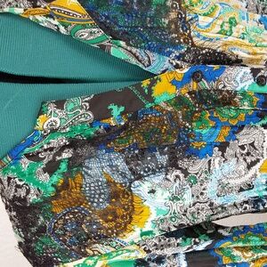 light ble, emerald green, back gold color tones ,v neck no colar neckline,5 black buttons up front, lace on upper top of blouse , armpit to armpit is 19", sleeve 17" ,length 29", material is polyester folded crease lines throughout material, new condition