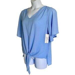 NY Collection Women's Elbow Sleeve V Neck Tie Front Blue Top Large NEW NWT