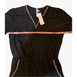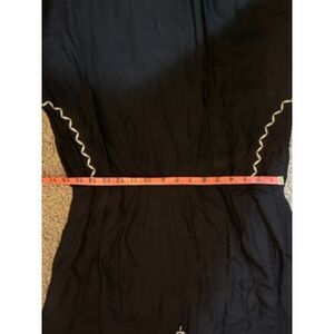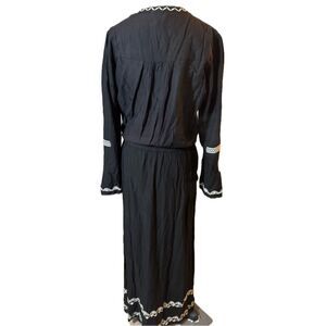 Lace up tassel tie neckline, pullover, V neckline, Long sleeves, Side cut away pockets, rich contrast embroidery trim. Elastic waist, sides slit, lined. Fabric rayon lightweight