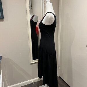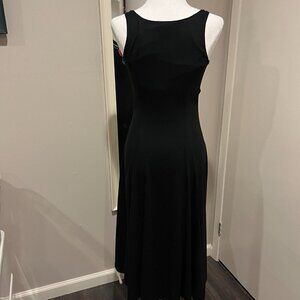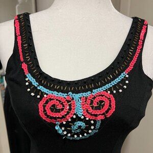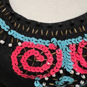 NY Collection black sleeveless dress with sequin blue and pink beadwork in front on collar, angled bottom, soft comfy material. Size XS