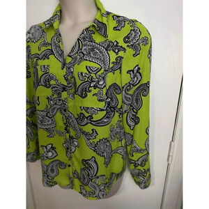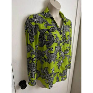 NY Collection lime Green & black paisley Western long sleeve blouse Button Downsize Medium #0600