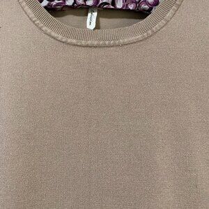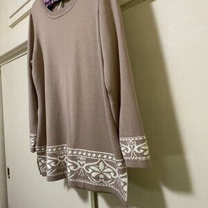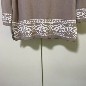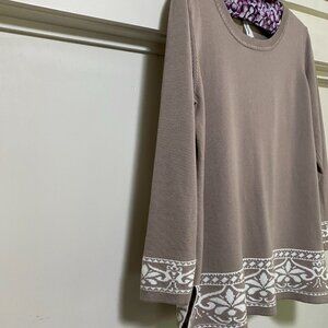 NY Collection tan sweater w/bell sleeves & white design trim, size L
