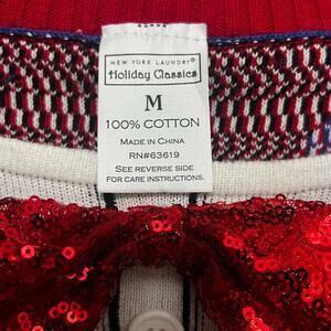 New York Laundry Holiday Classics Penguin Motif Ugly Christmas Sweater. Designed to look like a shirt and button front cardigan but is actually a pullover crewneck. Has an attached sequined bow tie. Red, white and blue.
