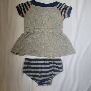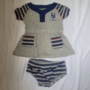 This is a 2 piece set for a toddler in size 18 months. It has the Mets logo and colors. It includes a short dress and diaper cover. In very good used condition.