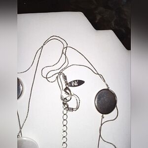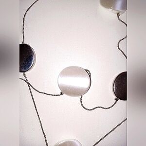 This is a well-crafted, classic, double strand, long necklace signed NY and features acrylic flat beads in 2 neutral colors on a silver tone chain.