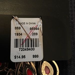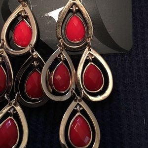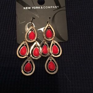 New earrings from New York and Company. Gold drops that connect to hang about 4 inches roughly with a reddish orange drops inside the gold. Very cool and can dress up any outfit