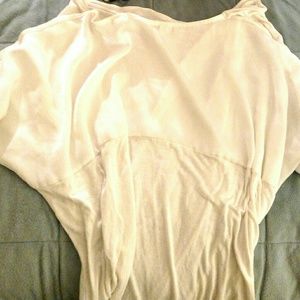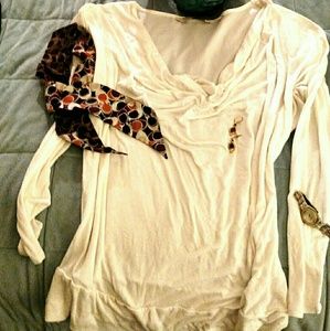 Great soft drape front cream top. Silky back pannel gives it a little pizzaz. Dress it up or down, a great essential to any wardrobe.