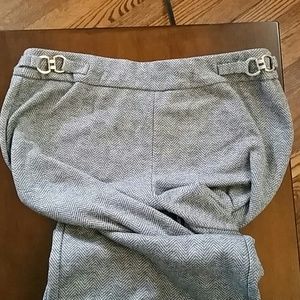 Super cute, soft and comfy. Dressy stretch pants woth flare bottoms. Gray with hounds tooth type pattern. Cute buckles in front. Size small but could fit a small M since the top stretches.