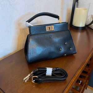 NY&C Black Handbag With Gold-Toned Hardware and Flowers Accent