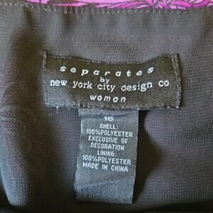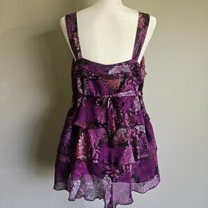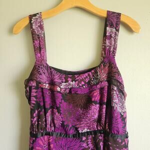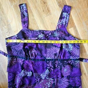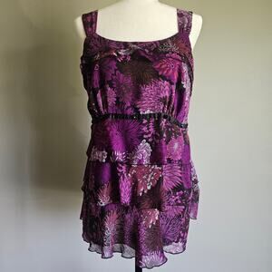 Vibrant and flowy tank top by Separates by New York City Design Co. Features a bold purple, black, and pink floral print with layered chiffon tiers that create soft movement. Square neckline with wide shoulder straps and an adjustable tie at the waist for a flattering shape. Fully lined. Made from lightweight polyester — perfect for dressy casual looks or summer evenings. Women’s size 16.