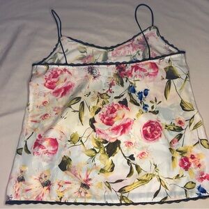 Romantic floral cami from New York & Company in size Small. Designed with an ivory/off-white base and a beautiful multicolor floral print featuring pink roses, green leaves, and pops of blue. Finished with delicate black lace trim along the neckline and hem. Lightweight, airy, and easy to style — perfect for warm weather or layering.