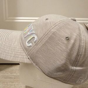 The Game New Canvas Light Gray Cap with the NYC Initials in Gray Metallica Lettering. Canvas Fabric with an Adjustable Back Strap. Cardboard Insert and Tag Attached. Polyester with 5% Spandex.