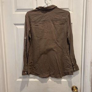 NY&C Large Brown Semi Sheer Button Up Shirt Roll Tab Sleeve Top Career Beachy