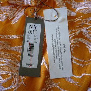 Eva Mendes for New York and Company: Orange with white embroidered flowers Sheath dress, SIZE 6, fully lined, hidden back zip with eye hook closure, off to the side v-neck bodice, sleeveless/cap sleeve style, fitted midi length, 100% nylon – pit/pit: 18”, length: 39” – NWT: new with tags