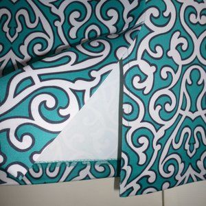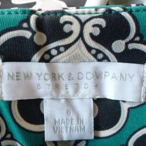 NY&C: New York and Company Midi Skirt – Turquoise, black and light grey pattern. Size 6, length 27”, waist 16”, 95% Polyester, 5% Spandex, stretch material. Hidden zipper and small slit in back, eye hook closure. GW: gently worn, great condition. (079)