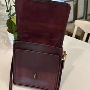 Vintage Coach Station Bag in Burgundy #5130 made in NYC. In overall great condition! Some areas are more patina-ed than others, resulting in areas that appear two-toned (for example, below the flap). The hardware on the handle seems to have changed colors to a silver, while the strap remains the color brass, not sure why. Comes with a non-adjustable strap, and a one-sided hang tag.