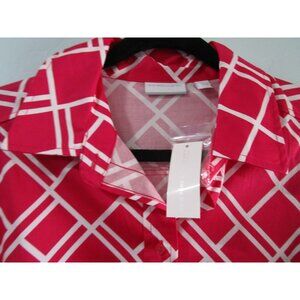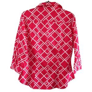 Brighten up your wardrobe with this funky geometric button-up shirt. Perfect for those days when you want to feel like a walking optical illusion. New with tags. Fuchsia or lipstick red.