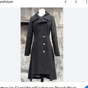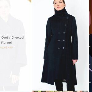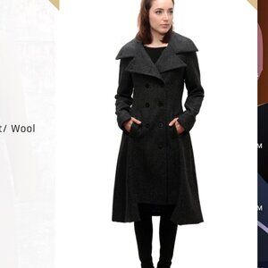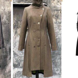 Unique details like the convertible collar, double breasted front, uneven sleeve & bottom hem along with the tailored fit make this a stunning coat. The dramatic collar can be worn open flat or button up into a high funnel neck to keep out the cold. The bottom side & back panels fluidly drape for a feminine fit.