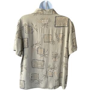 Relaxed 90s-style button blouse with matching tank in soft sage/neutral. Easy drape, collared camp-shirt silhouette; lightweight textured crepe with a rayon-like hand. Neutral patchwork/botanical vibe; minimalist/cottagecore friendly. Condition: Good vintage.