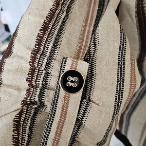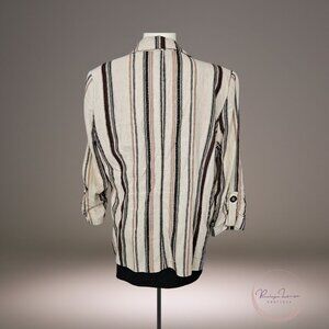 Effortlessly cool NYCC New York Clothing Co. linen-blend blazer in size Medium. Natural woven texture with vertical stripes in soft brown, tan, and black. Open front, relaxed fit, and roll-tab sleeves with button detail.