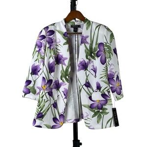 Elegant white jacket with vibrant purple floral design. Features a sleek, open front style. Perfect for a spring look. Unlined. No pockets.