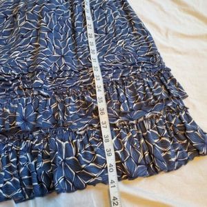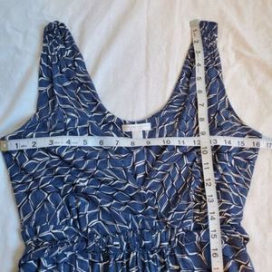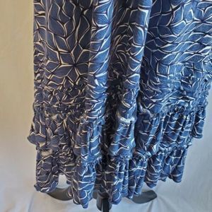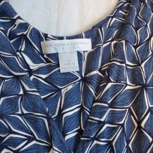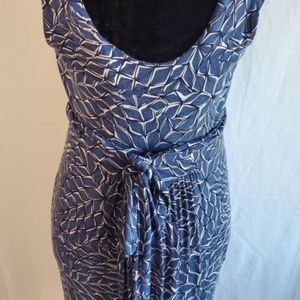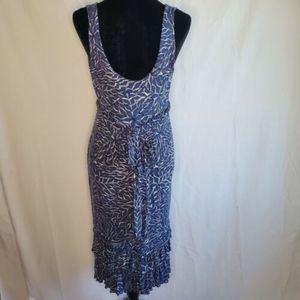 is a gorgeous dress providing great stretch. Features a ruffled hem and a waist tie. Blue and White pattern. New York & Company Stretch. Size Medium. Please see pics for detailed depictions and approx. measurements.