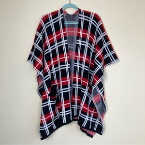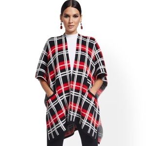 NY&Co Plaid Open Front Poncho Cardigan w Front Pockets Black/Red/White