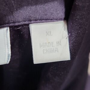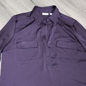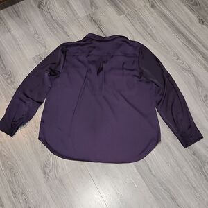 NY&Co Plum Purple Silky Long Sleeve Button Top, no flaws at all and 2 front pockets. Beautiful color and quality and can be buttoned 3/4 sleeve. Pit to pit is 22" and 29" long.