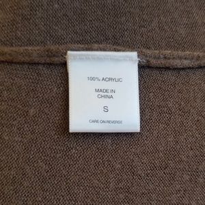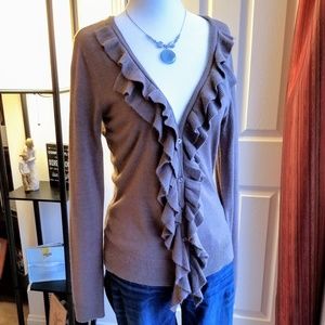 Brown button-up cardigan with ruffled trim from shoulders to waist. Great with a cami or tank!