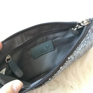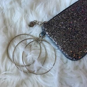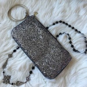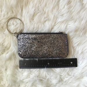 NY&Co, Silver Glitter Bangle Wristlet | Gorgeous Sparkly Silver On the front & Pewter Satin on the Back | Gray NY&Co logo fabric for Lining w. One spacious zippered pocket | Three Silver Bangles serve as the handle for this Crazy Cute Bag 🍾 Perfect Night on the Town Accessory! • Measures 8" L x 4.5" H - Plenty of Room for Keys, Phone, Cards, Cash and Gloss! Excellent Condition 💙 Feel Free to Make an Offer!