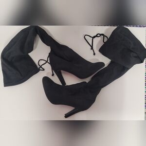 NY&Co Tall Black Suede Feel (man made) Boots Pull On With Top Drawstring 8