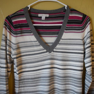 This size XS women's v-neck sweater is in excellent condition without any tears, stains or pilling. The classic stripe design is white, gray, black and fuchsia. It comes from a pet-free, smoke-free home.