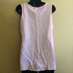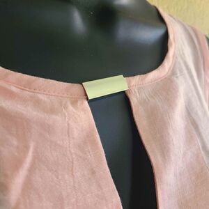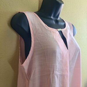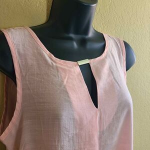 This is a light pink sleeveless blouse by NY Collection. It has a keyhole opening on the chest with a silver tone embellishment at the top.