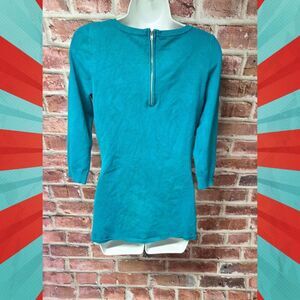ny collection green top, tie waist blouse medium, 3/4 sleeve lightweight knit, rayon nylon sweater shirt, poshmark women’s fashion, flattering waist belt blouse, invisible back zip top, green round neck sweater, transitional season knitwear, stylish work casual top