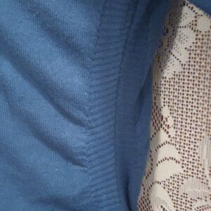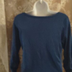 NY Collection blue 3/4 length sleeve ruched side and sleeve, open grommet accent on neckline, pullover sweater size large, excellent condition